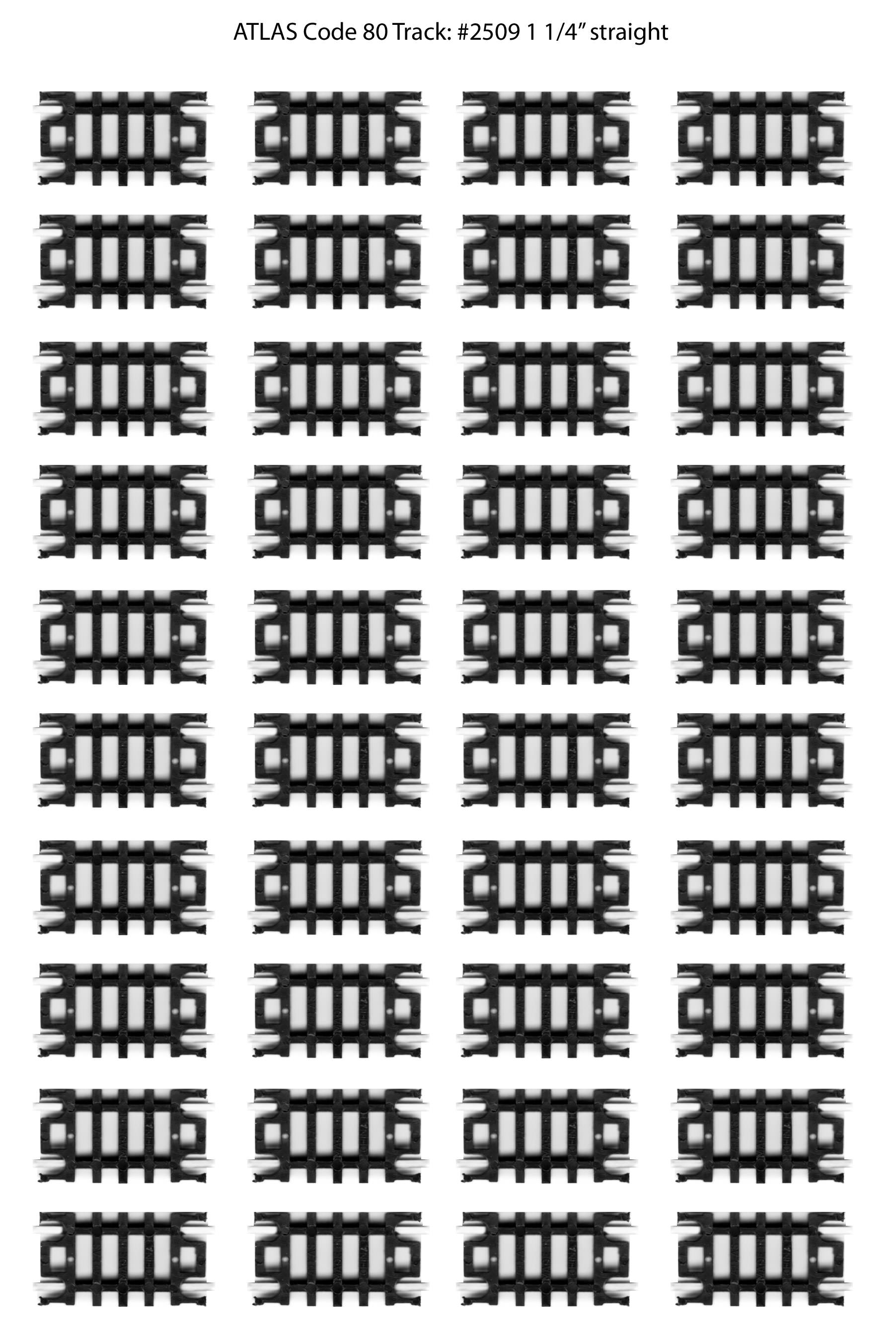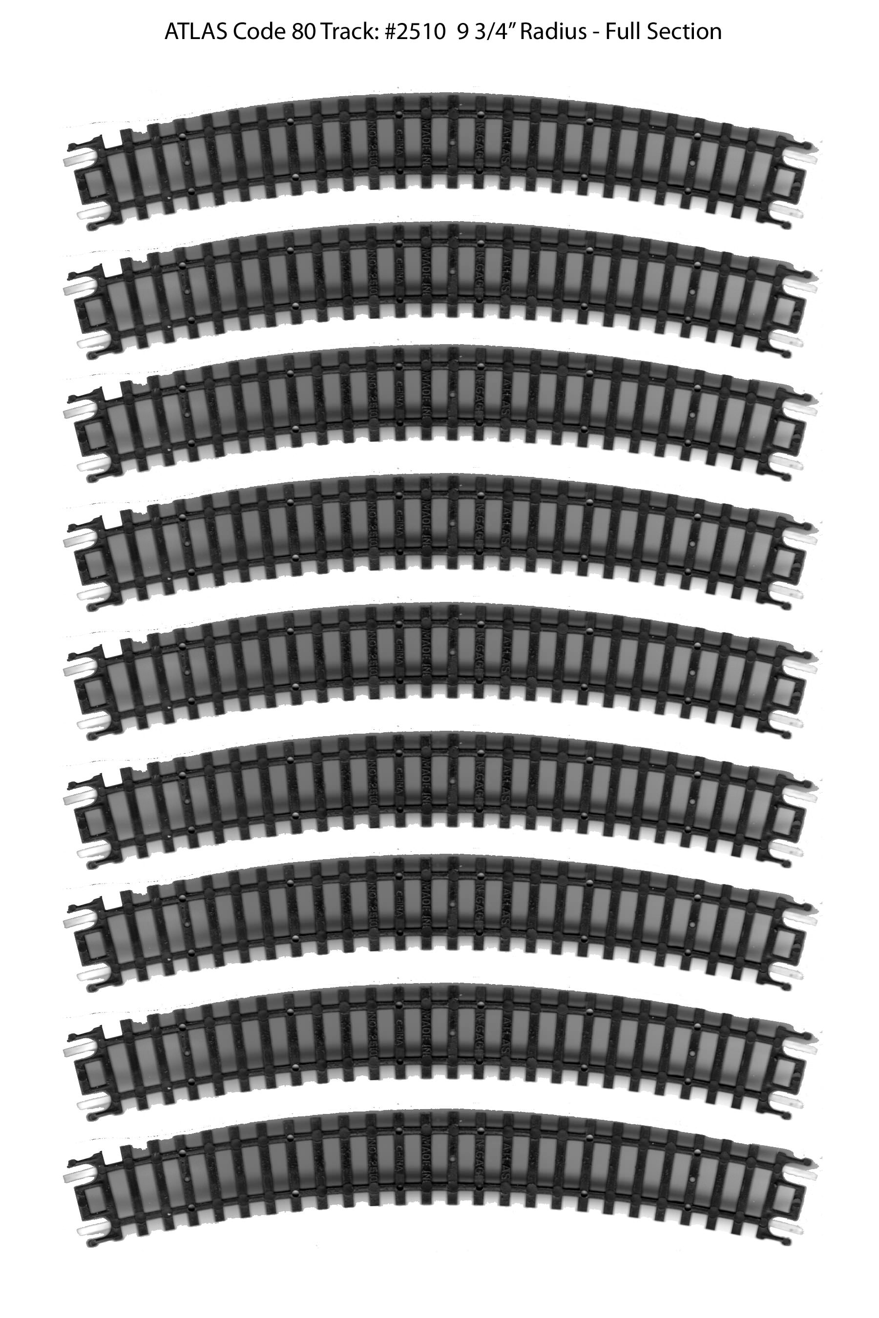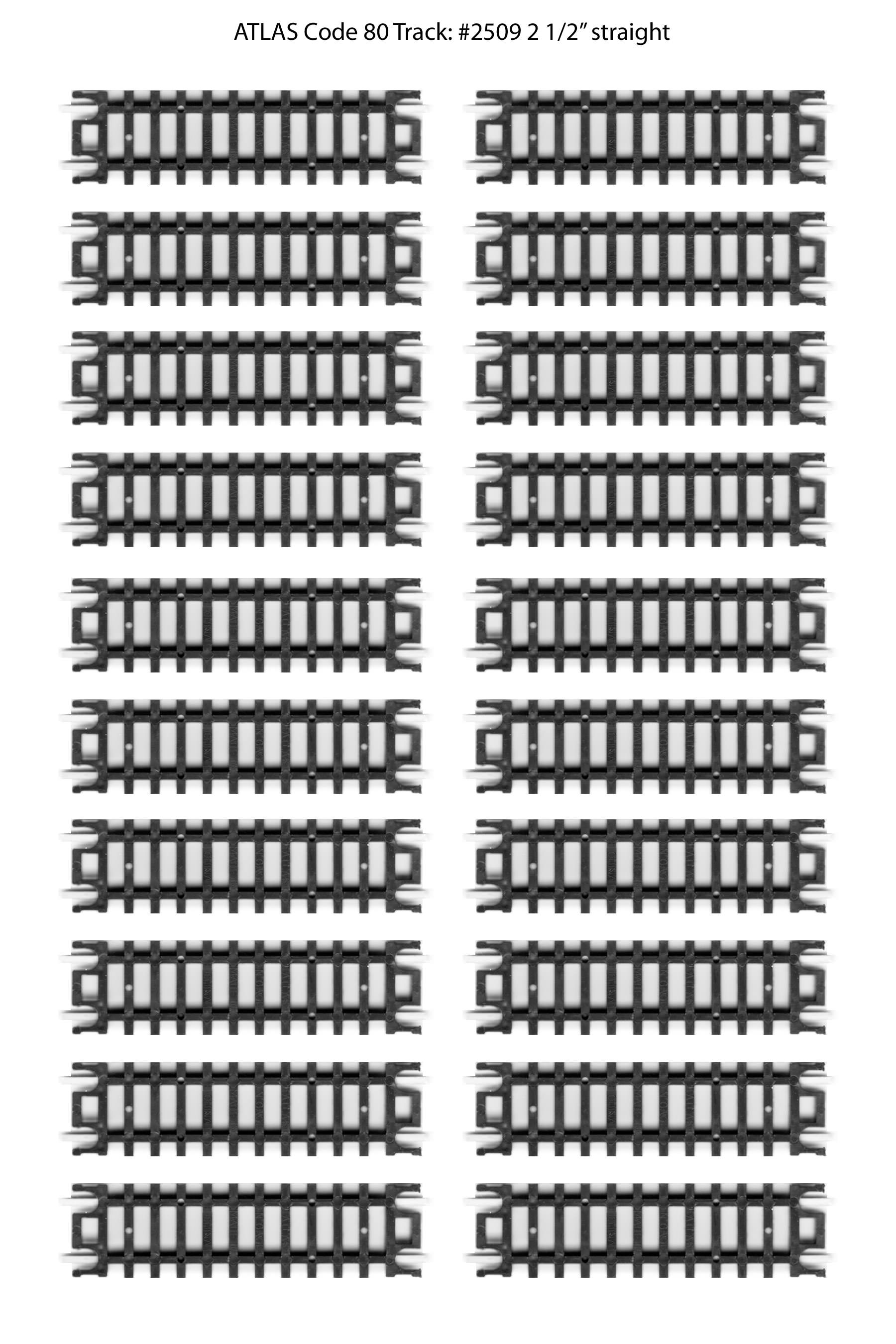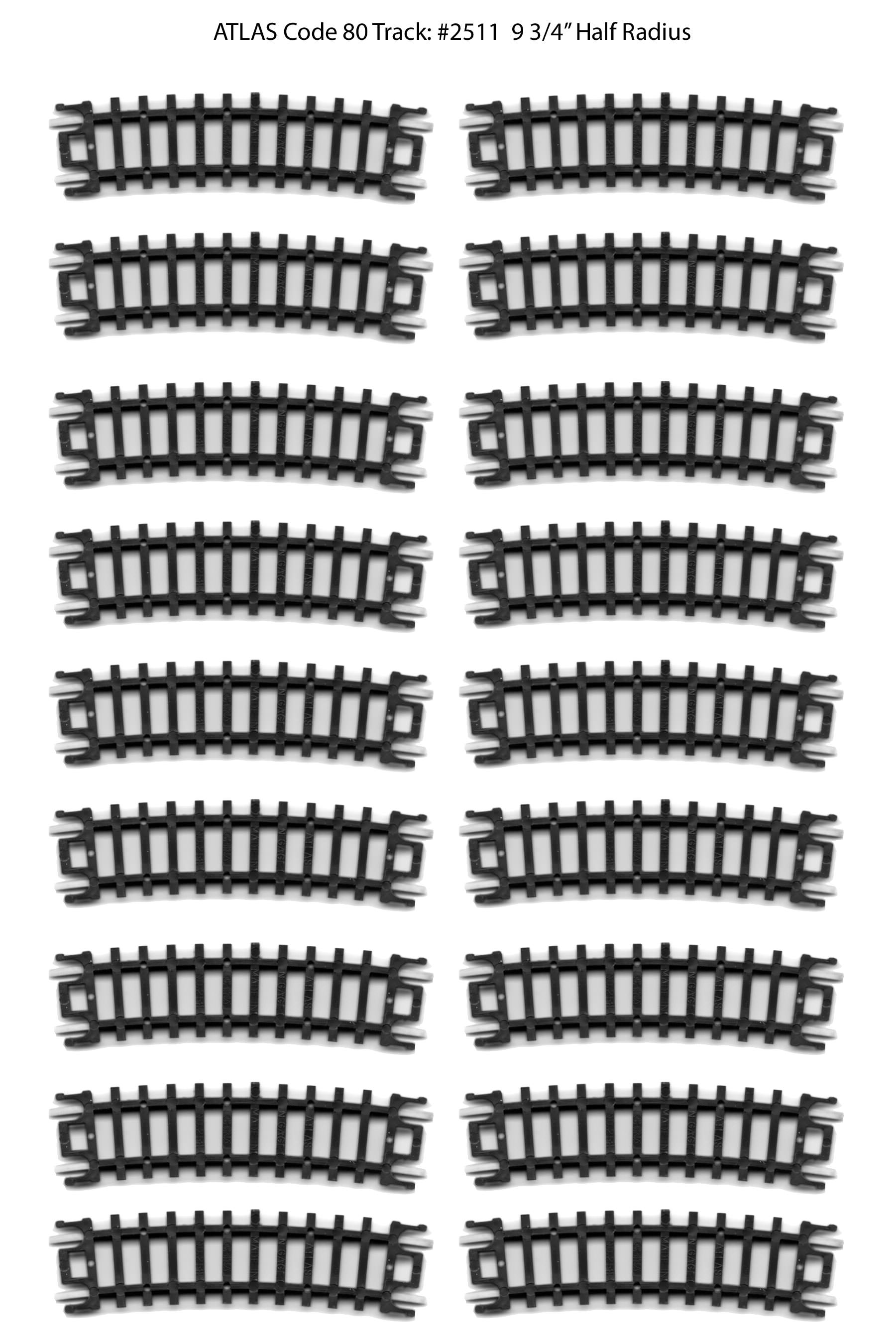 I haven't put them down on the benchwork yet, but in the meantime I thought I'd post them here for downloading by anyone else who might be looking for the same thing. I'm sure seasoned modelers have lots of spare track laying around, but for new-comers like me this might be helpful. For reference, this is Atlas N-Code 80 track. The image below are 300 dpi jpeg files. If you print them out at 100%, they should be the exact size of the real thing. I've posted the Atlas part number as part of the file name (note #2509 is a 'variety pack' that contains 3 different sizes of track). You can right-click to download/save the images.