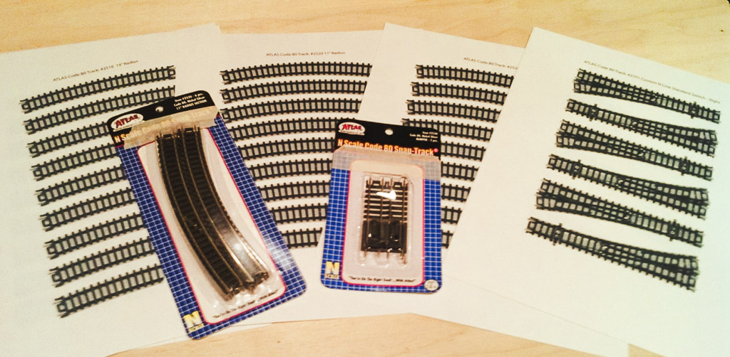 So, I figured I'd download some type of templates, print them out and see what fit. No dice. I couldn't find templates anywhere. I did see a couple from a few manufacturers that I could order, but I didn't really feel like waiting, paying for shipping, etc. I went to a local shop and picked up 1 package of each type of track for the layout I think I'd like to use. I scanned each piece and printed them out on slightly thicker than normal paper/card-stock. Just rigid enough to feel somewhat substantial, but not thick enough to gum up my inkjet.